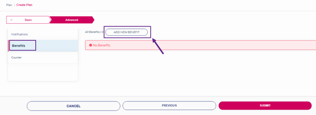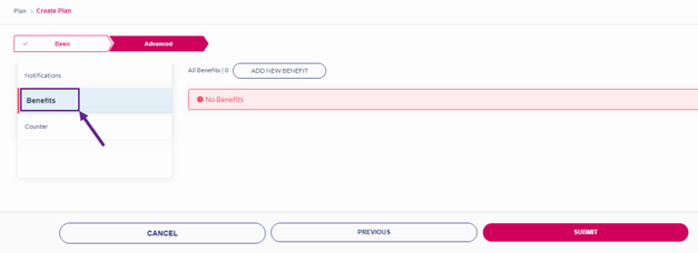 1. After adding the Notification, click Benefits to add a Benefit to the rate plan. Refer to the following screen.