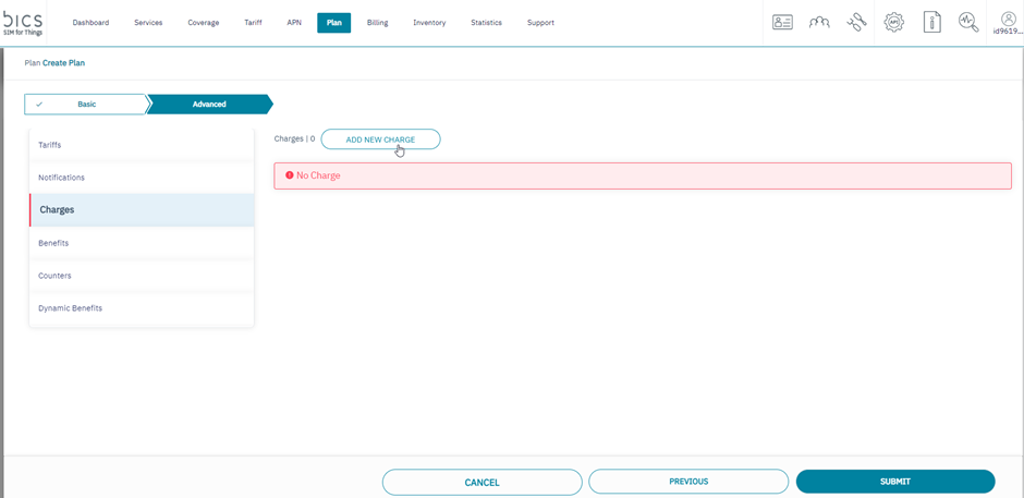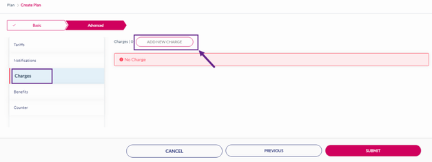 1. After adding the Notifications, click Charges to add charges to the rate plan. Refer to the following screen.