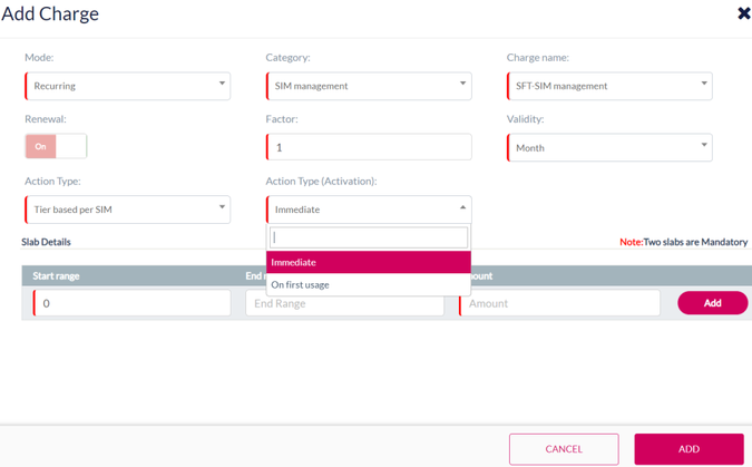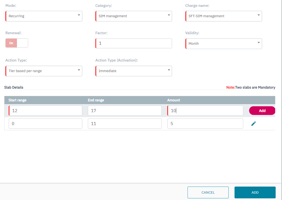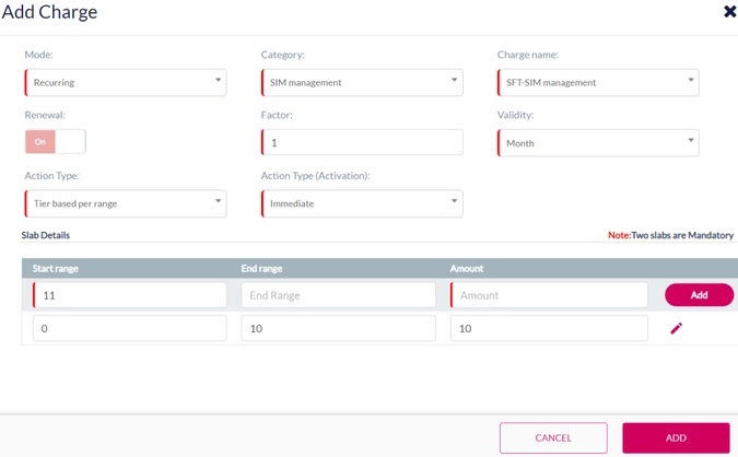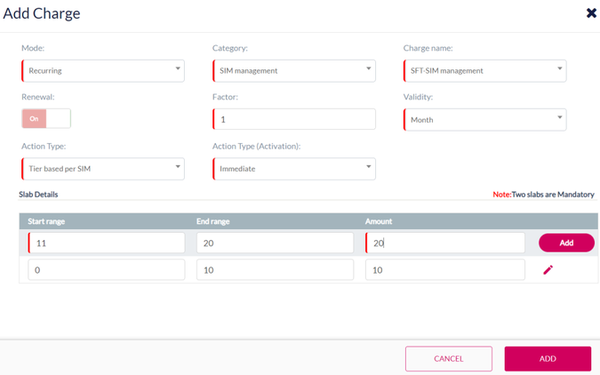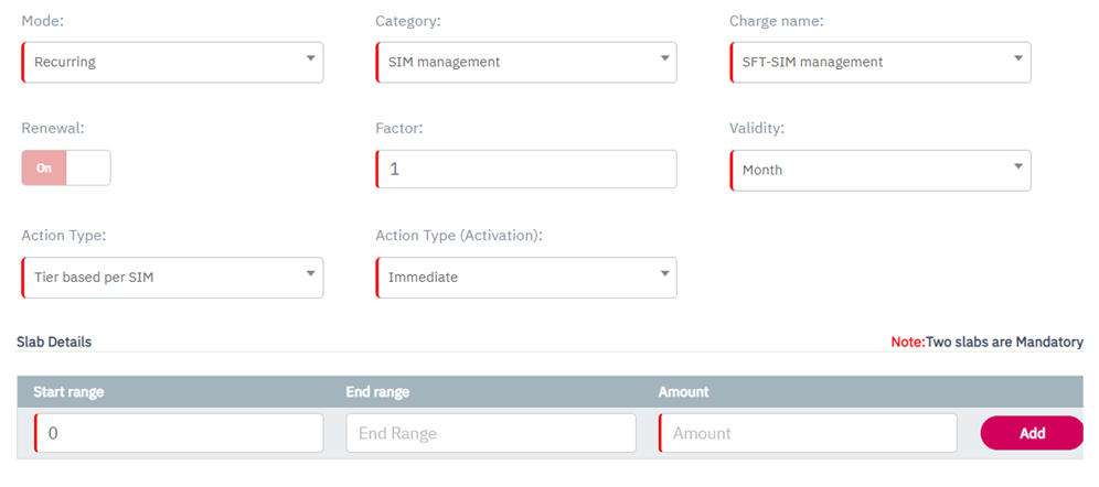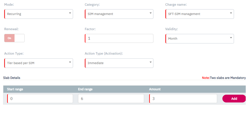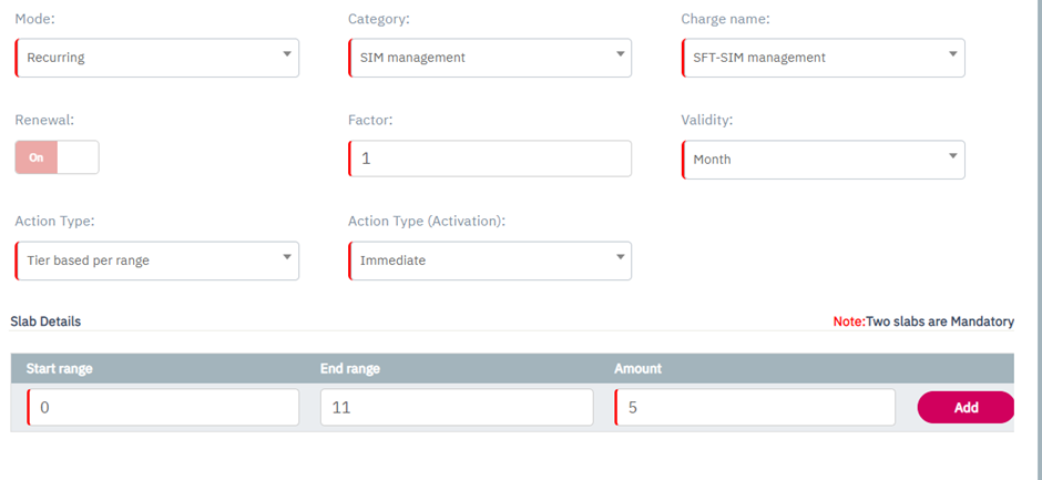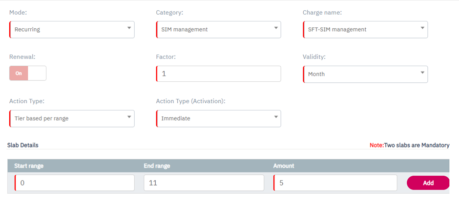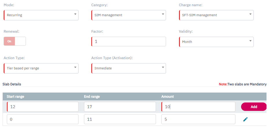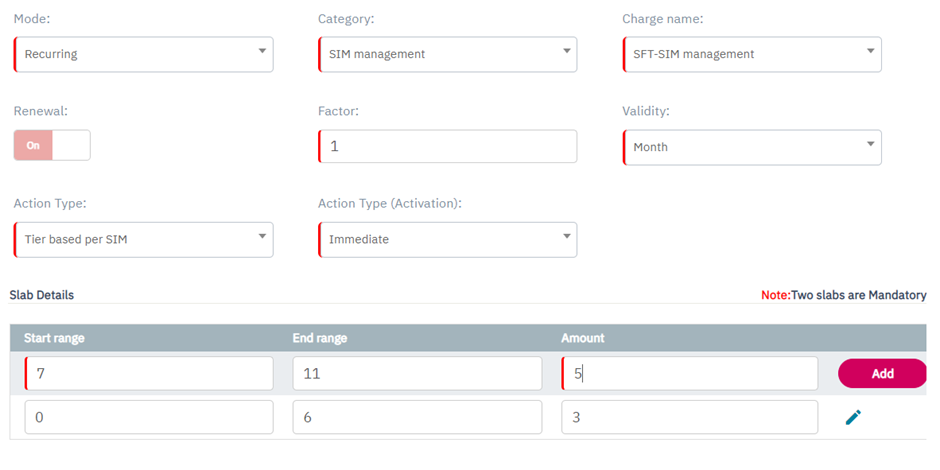 Note: Minimum two slabs are mandatory to create Tier based per SIM charging.