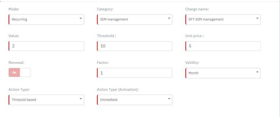 Value | By default, this field is not displayed. This field is displayed when you select "Monthly Recurring Charge" as Category or "SIM Management" as category with "Threshold based" as Action type or "Normal" or Feature based SIM management as Action type. |