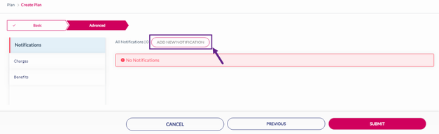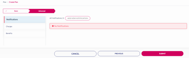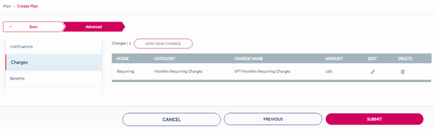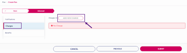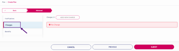 15. After adding the Notifications, click Charges to add charges to the rate plan. Refer to the following screen.
