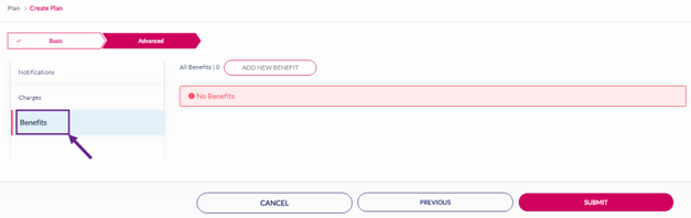 22. After adding the Charges, click Benefits to add a Benefit to the rate plan. Refer to the following screen.