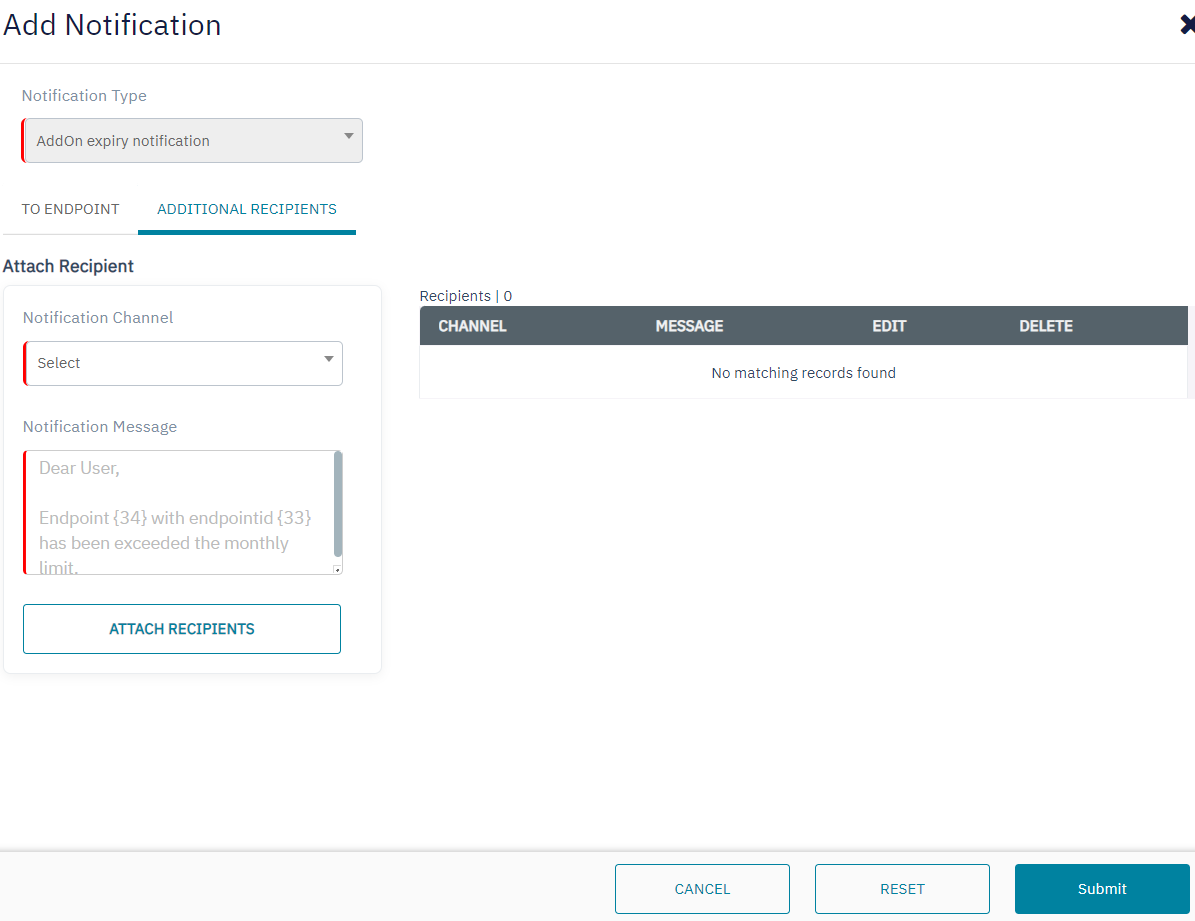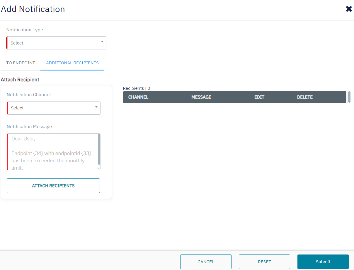 Notification Channel | Select the channel through which the notification needs to be sent. Note: Email and API is applicable only for Additional recipients |