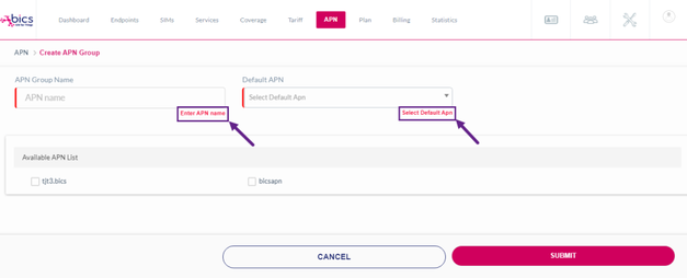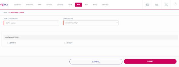 Default APN | Select the Default APN for the APN Group. APNs are assigned to enterprise by MVNE or Reseller. |