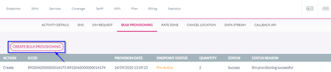 3. On the Bulk Provisioning screen, click Create Bulk Provisioning. Refer to the following screen.