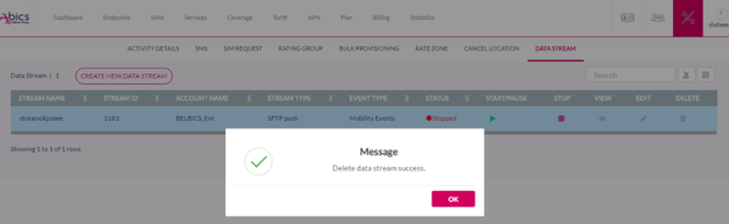 3. After clicking Yes, a confirmation message is displayed indicating the data stream is deleted successfully.