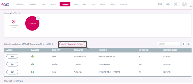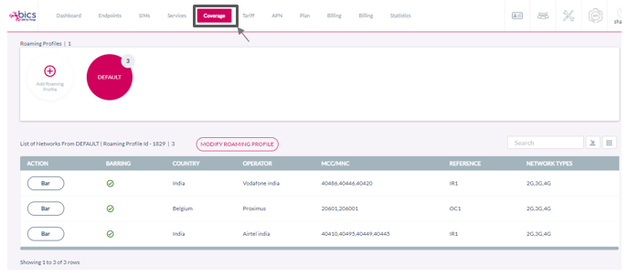 1. On the top menu, click Coverage to view the roaming profile details. Refer to the following screen.