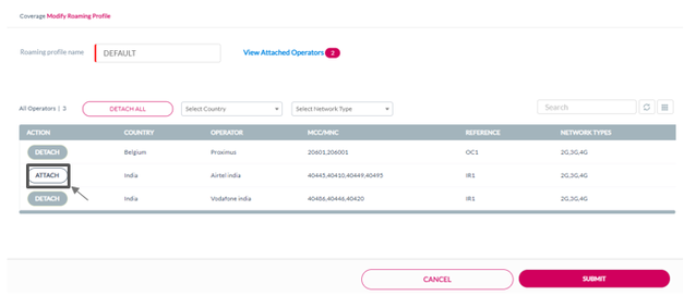 Click Attach displayed against an operator to attach the operator to the roaming profile. Refer to the following screen.