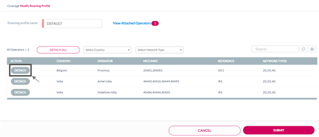 Click Detach displayed against an operator to detach the operator from the roaming profile. Refer to the following screen.