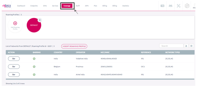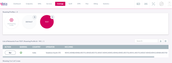 1. On the top menu, click Coverage to view the roaming profile details. Refer to the following screen.