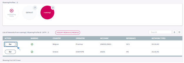 Click Bar displayed against an operator to bar the operator from the current roaming profile. Refer to the following screen.