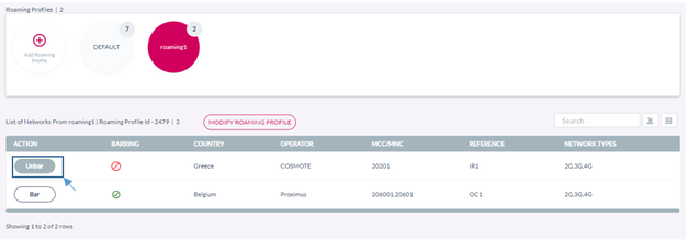 Click Unbar displayed against an operator to unbar the operator from the current roaming profile. Refer to the following screen.
