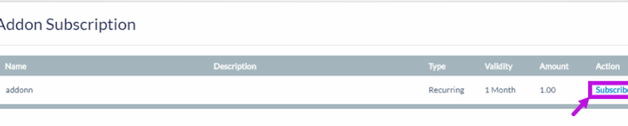 After clicking Subscribe, a confirmation message is displayed indicating that the Addon is successfully activated. The newly subscribed addon will be displayed in the overview section.