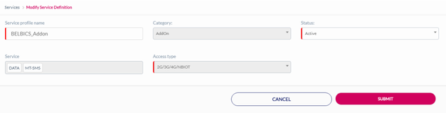 For Service profile with "Addon" as Category, you can modify the following fields in the Modify Service Definition screen.
