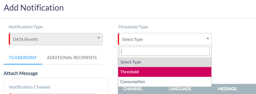 If selected Threshold, then enter any free text value for threshold(SMS in count/Data and NB-IOT Benefit,Data and NB-IOT Counter Notification in MB) . For “Counter Notification” notification triggers when the consumption reaches threshold .