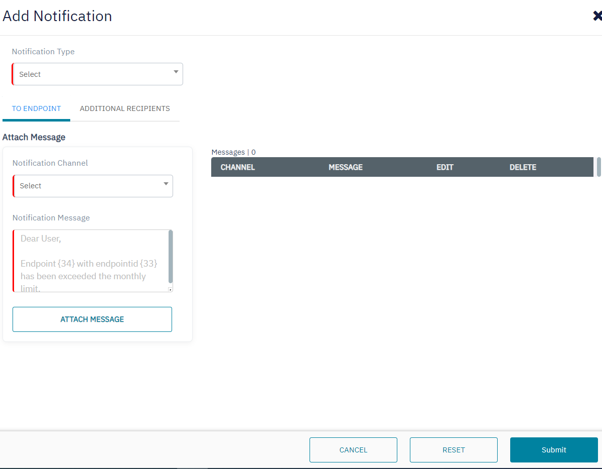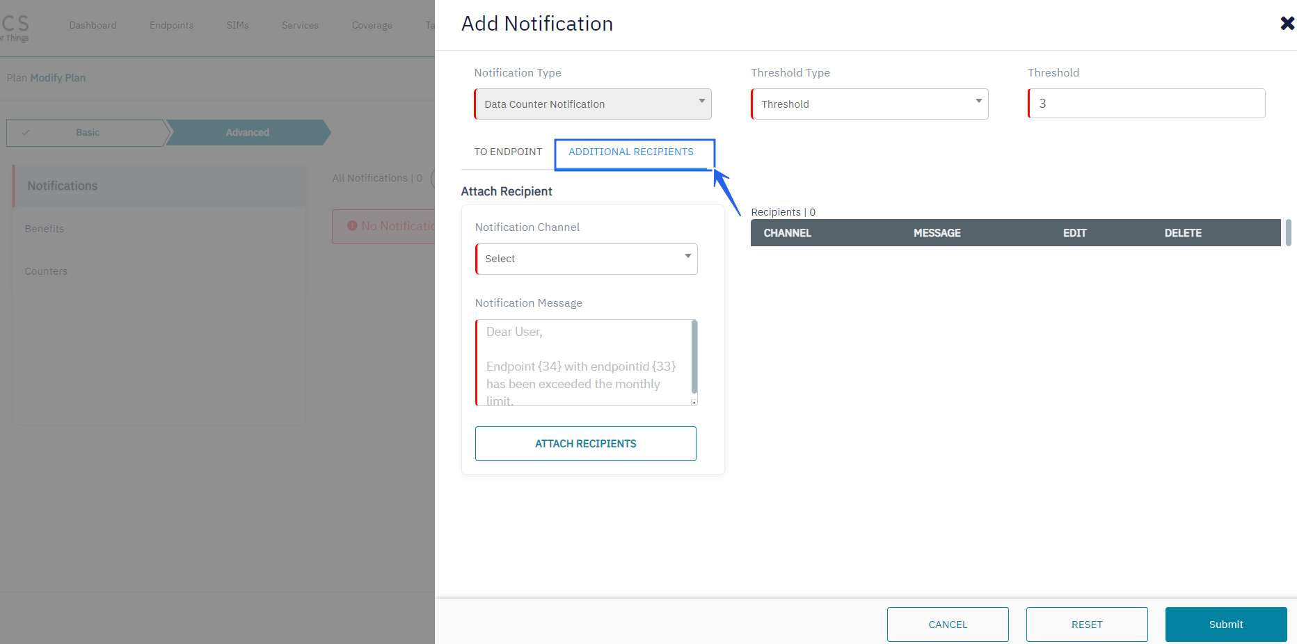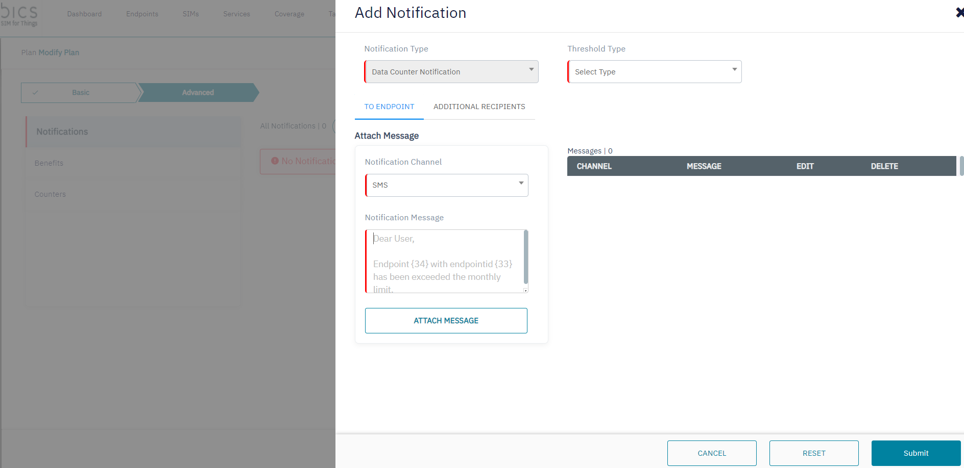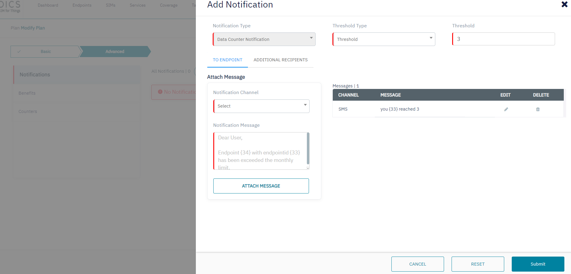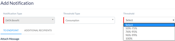 Monthly limit reached notification – When the monthly quota for the profile is reached, a notification is sent to the endpoint or additional recipient based on the notification configuration. Note: Monthly limit reached is applicable for Postpaid connection only