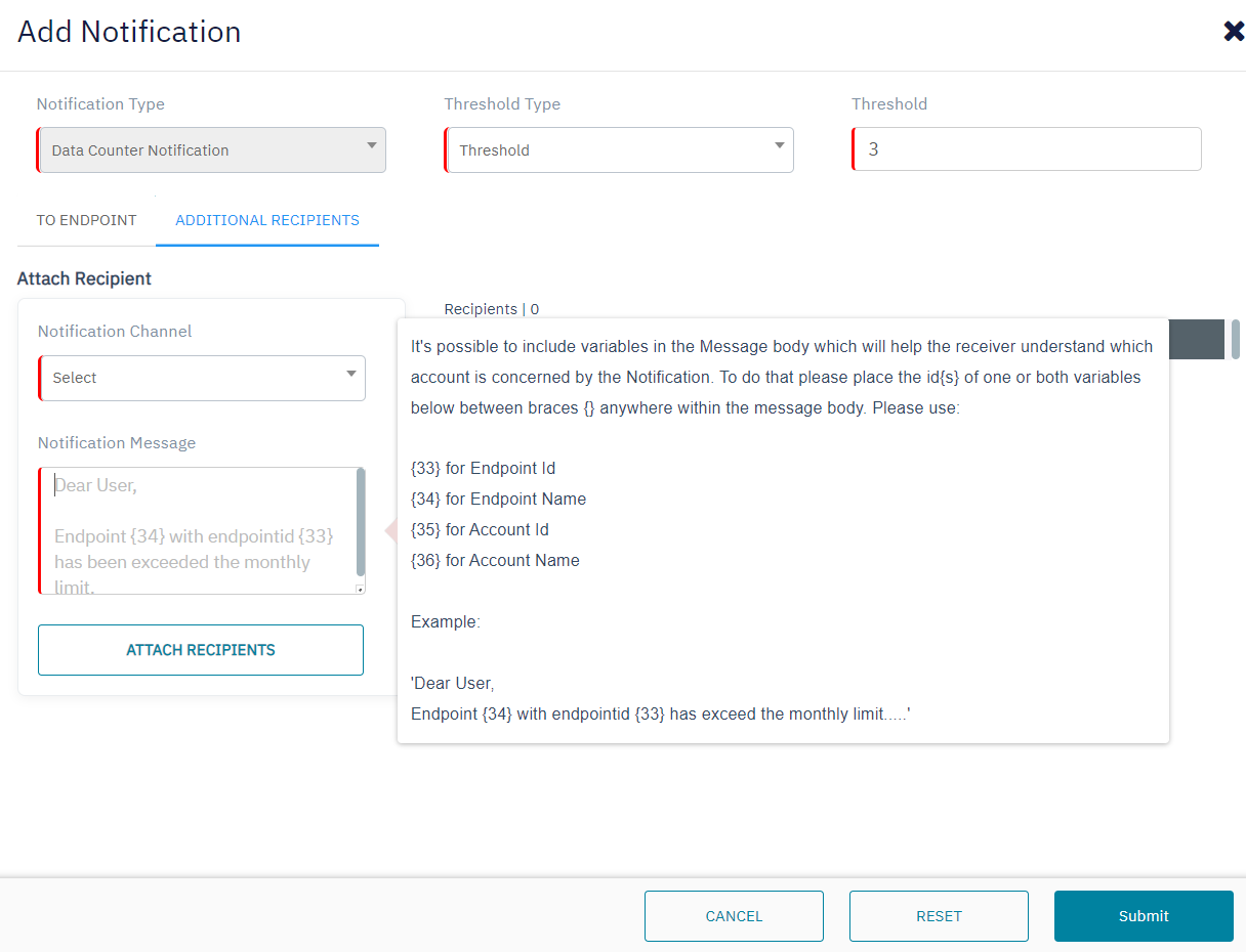 Data counter notification – Based on the notification configuration, a notification is sent to the account or additional recipients about the Data Counter available in the base plan.