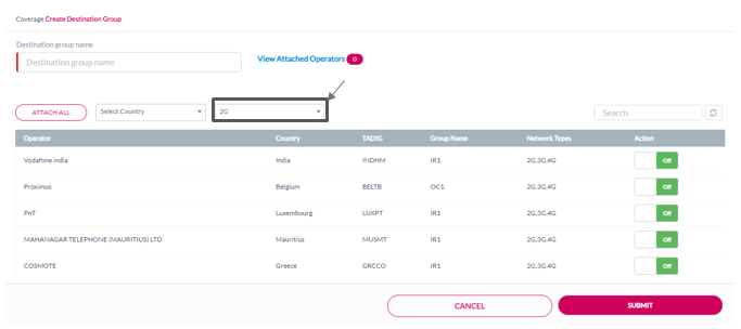 You can filter the operator details for a specific Network in the Select Network Type drop-down list. For example, select 2G to view the operators available for 2G Network.