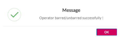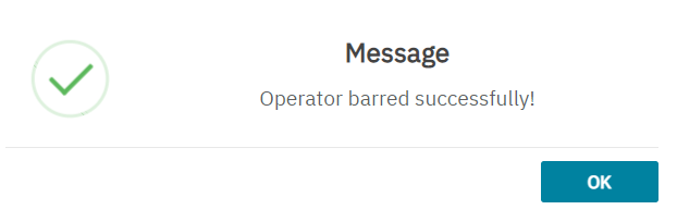 After clicking Yes, a confirmation message is displayed indicating the operator is Barred or Unbarred successfully.