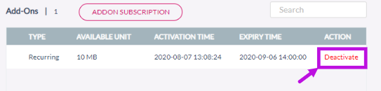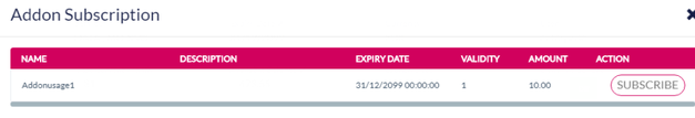 Activated by | Type of activation (“Activation on Subscription” → “Subscription”/”Activation on Usage” → ”Usage” ) as configured in “Activated By” of the AddOn plan | ||