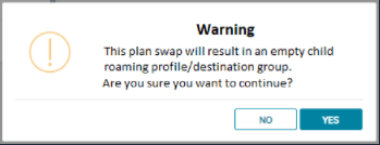 If the plan swap results in an empty destination group or roaming profile, on Plan Details screen, after selecting plan, the user gets the following WARNING message: