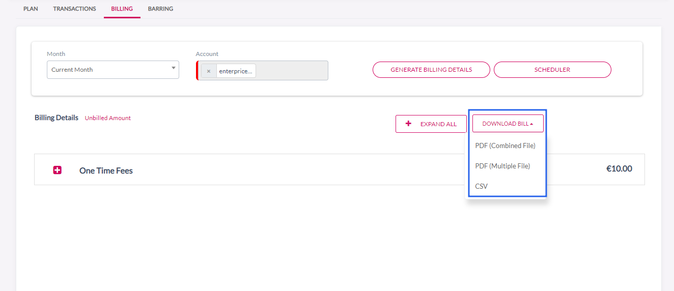 Download Bill which allows to choose the download format PDF(Combined file, Multiple file), CSV. Select required format to download the Billing Details for that particular month