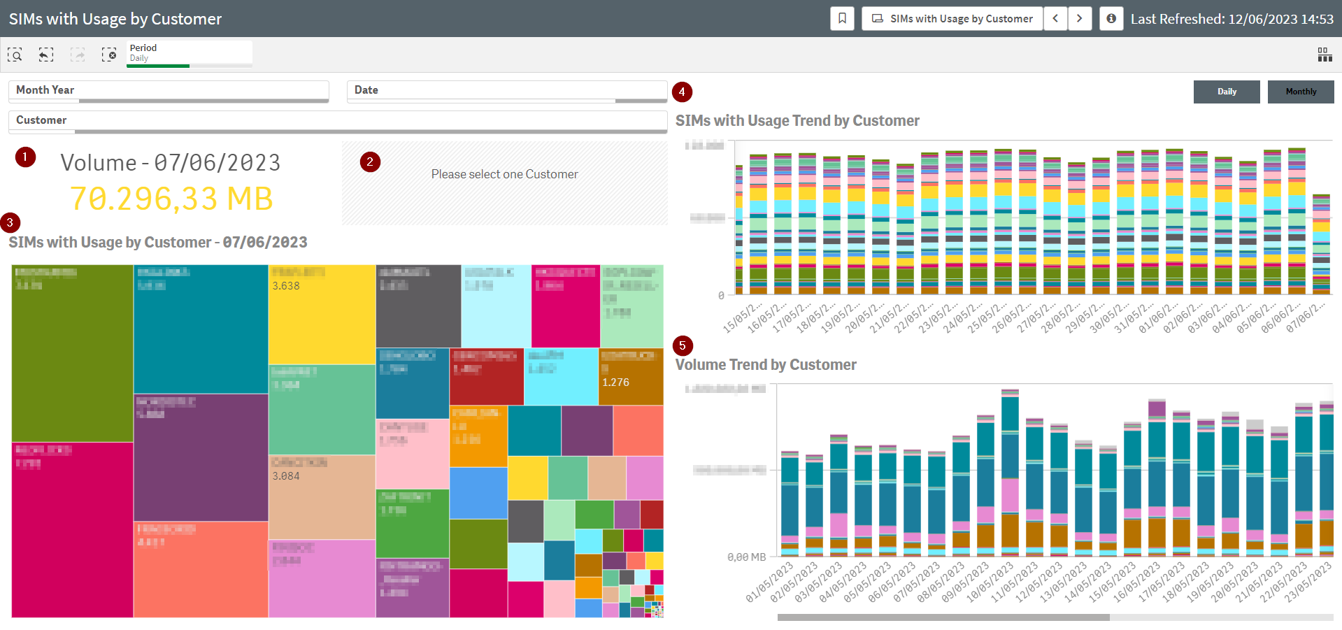 3 - Mekko chart with Number of SIMs with Usage on the last available/selected periods by Customer