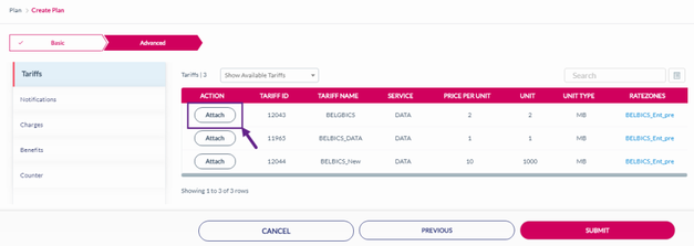 On the Tariffs tab, click Attach displayed against the Tariff ID to attach the Tariff to the Rate Plan. Refer to the following screen.