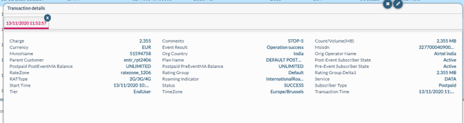 Count/Volume(MB) | If the service type is data, the volume of data consumed in Megabytes (MB) during the transaction is displayed.The value shall be displayed with 3 decimals. |