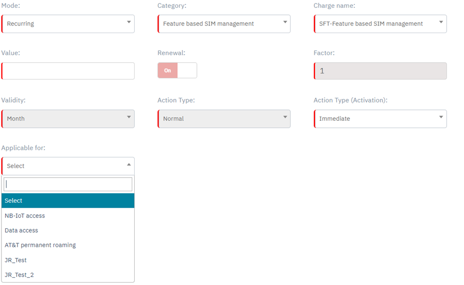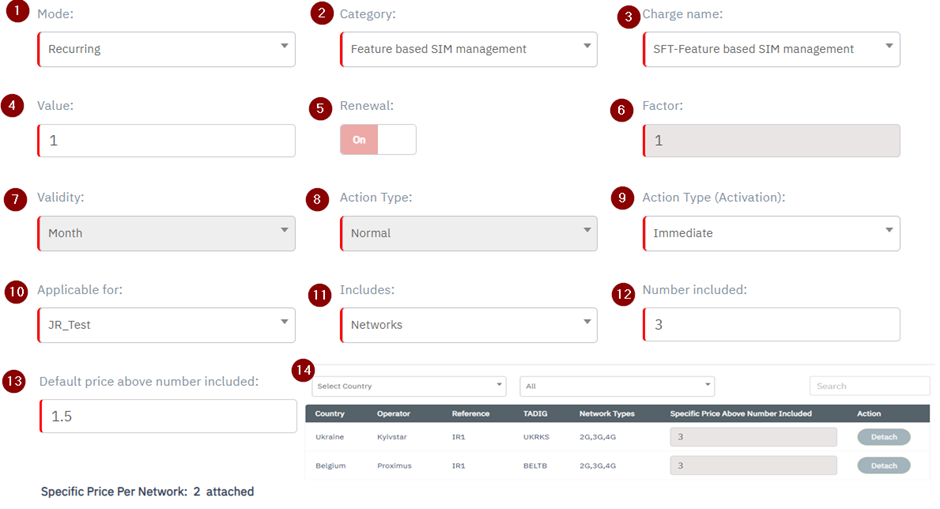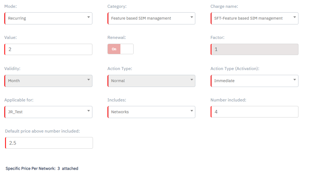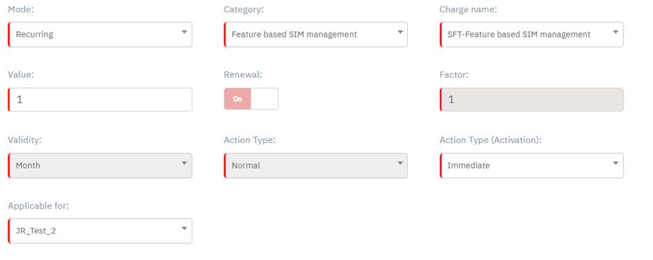 SFT – Feature based SIM management fee – This charge is shown when Feature based SIM management fee is selected as Category as part of Charges section. This fee will be charged based on SIM provisioning and networks usage, and on top of the normal SIM management fee.