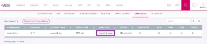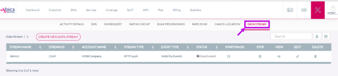 Start/Pause | Start/Pause button will be active only when the status is set to Activated for the data stream by BICS button, system will change the stream status to start. System will start generating the file in this state. Start button is available to users with the right permissions. button, system will change the stream status to pause. In Pause status, stream is producing the files without them been forwarded to the customer. Pause button is available to users with the right permissions. |