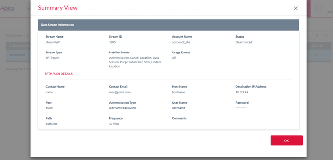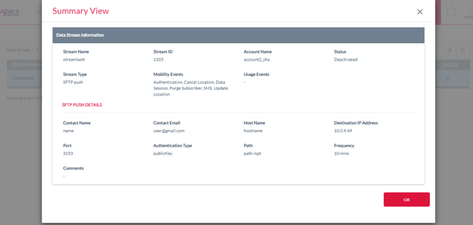 Summary View of SFTP Push with Authentication Type as Public/Private Key Data Stream and selected only Mobility Events.