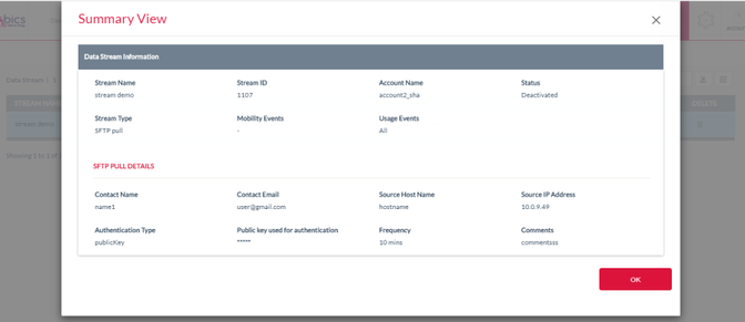 The following Data Stream details are displayed on the summary screen of SFTP Pull data stream.