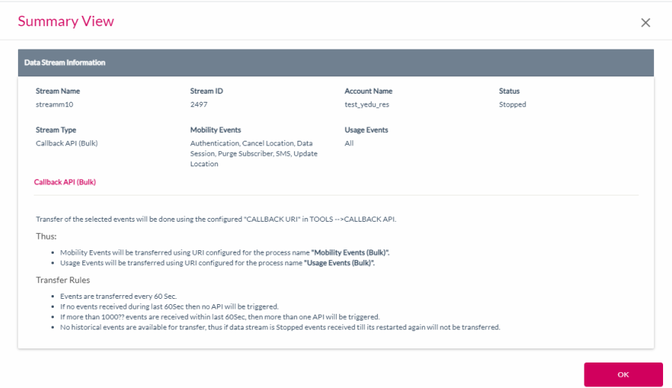 The following Data Stream details are displayed on the summary screen of Callback API(Bulk) data stream.