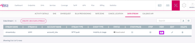 View | Click on View icon to see the summary view of the Data Stream. |